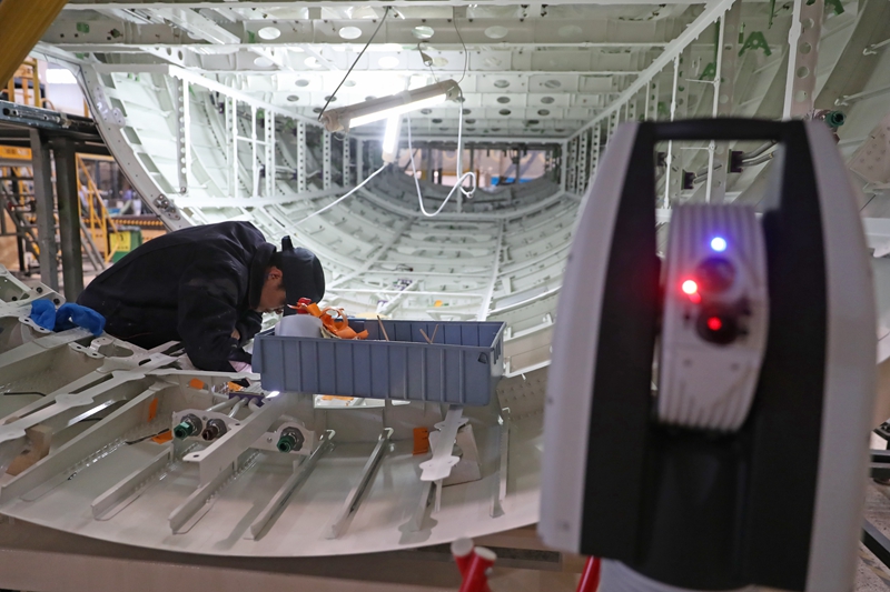 在航空工业沈飞民机车间,工作人员对机身进行检验工作(4月25日摄)。