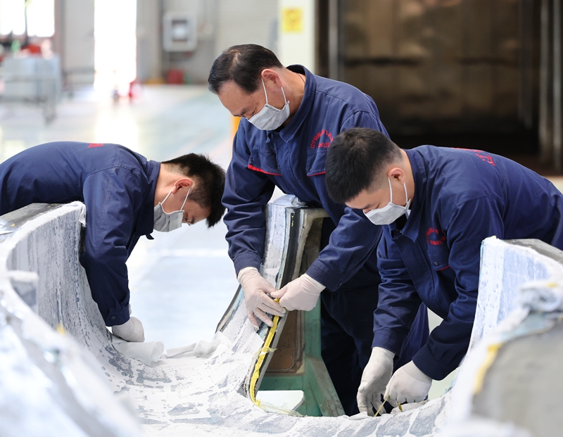 在航空工业沈飞民机车间,工作人员进行机身半壳铆接作业(4月25日摄)。