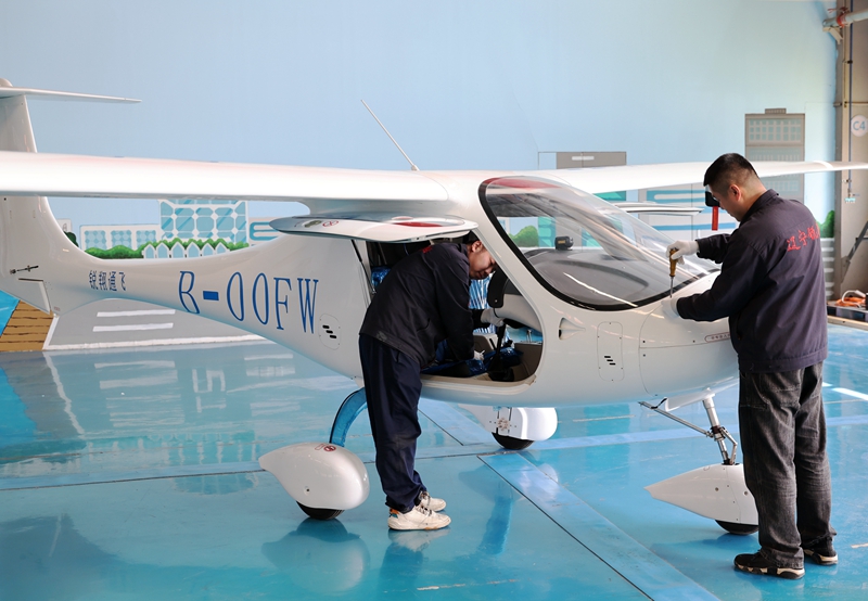 在沈阳的辽宁锐翔通用飞机制造有限公司,工人在进行飞机终装生产(5月13日摄)。
