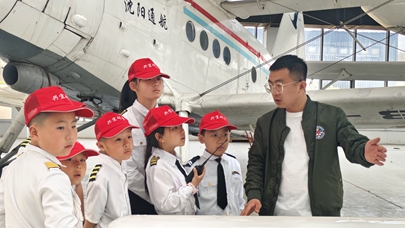 在沈阳法库通用航空产业基地,小朋友利用假期到辽宁联航神燕飞机装配车间参观(5月3日摄)。