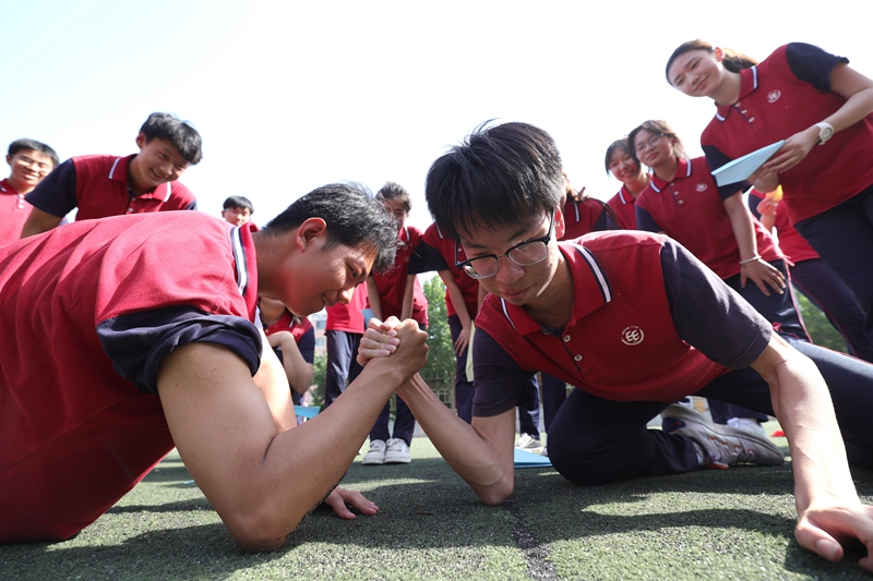 5月14日,在河北省石家庄市第二十二中学,高三学生进行掰手腕比赛。