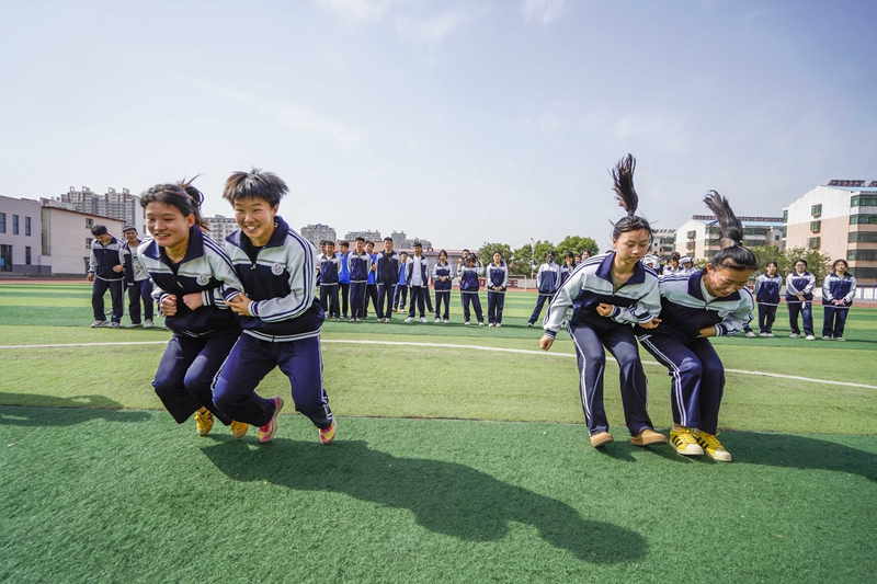 5月14日,河北省遵化市第二中学的高三学生在操场进行趣味游戏活动。
