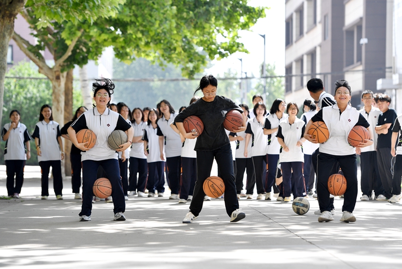 5月14日,山东临沂第七中学高三学生在跳绳。