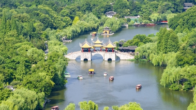 6月10日,游客在江苏扬州瘦西湖风景区游览(无人机照片)。