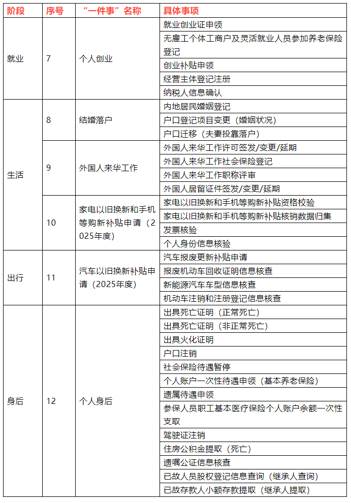 《清单》中包含固定资产投资项目审批、新车上牌等企业事项和结婚落户、家电以旧换新和手机等购新补贴申请(2025年度)、汽车以旧换新补贴申请(2025年度)等个人事项